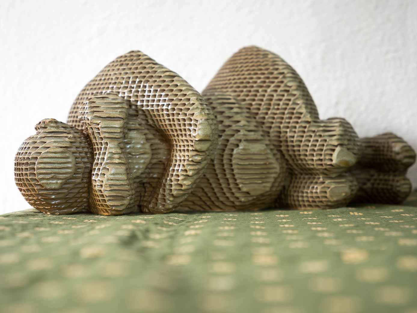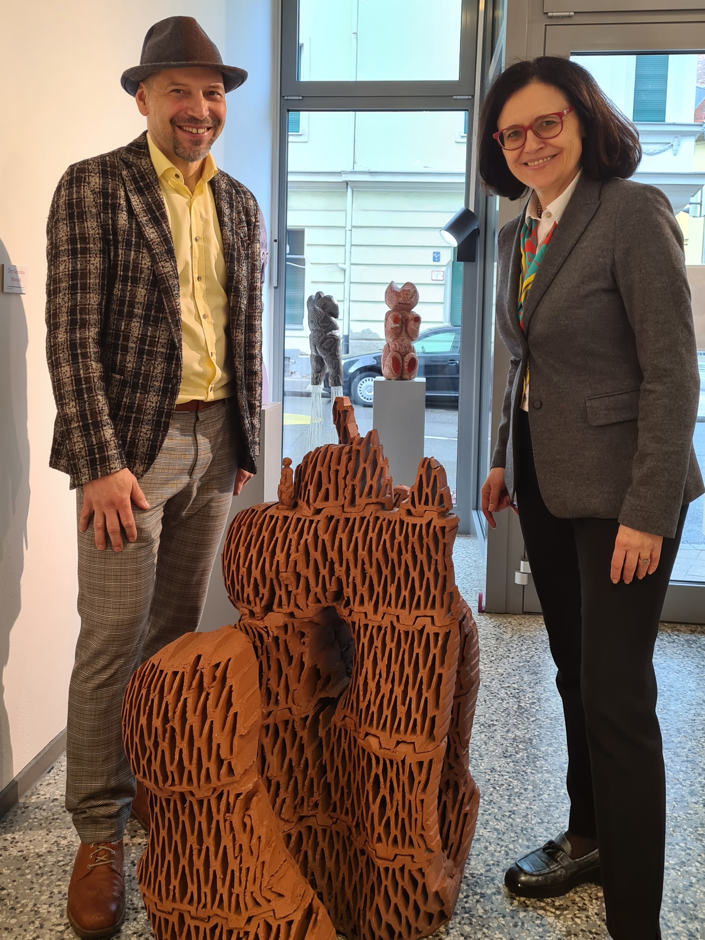 Eröffnung durch LAbg. Mag.Dr. Sandra Holasek. Extrudate sind formbare, dickflüssige Massen, die unter Druck kontinuierlich aus einer formgebenden Öffnung herausgepresst werden. Somit können Profile mit komplexen Querschnitten in beliebiger Länge hergestellt werden. Keramische Extrudate sind unter anderem Hohllochziegel oder Wärmetauscher. Gregor Fauland haucht diesen technisch produzierten Formteilen neues Leben ein, indem er den Kern von der äußeren Hülle trennt!